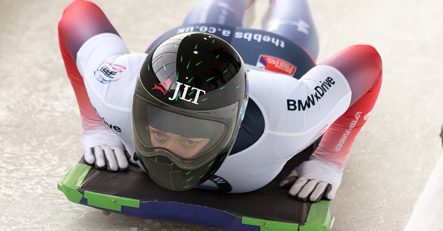 Пикантная деталь в том, что спортсмен скользит буквально на лице — оно находится всего в нескольких сантиметрах надо льдом — на скоростях до 130 км/ч. Только закрывающий всю голову шлем спасает его от травм, если он коснется подбородком трассы.