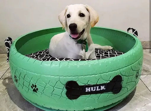 Ни один пушистик, даже самый избалованный, не откажется от нового дома. И его можно сделать своими руками, взяв за основу старую автомобильную шину. Только для начала тщательно вымойте ее, высушите и положите внутрь толстую подушку или одеяло. Если хотите, можете покрасить ее безопасной для животных краской, чтобы лежанка лучше вписывалась в интерьер.