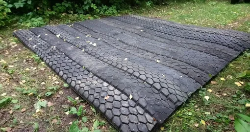 Напоследок не менее полезная идея: если готовы приложить немного усилий, разрежьте шины (желательно несколько) на ленты и скрепите их друг с другом строительным степлером или клеевым пистолетом. Получится отличный антискользящий материал, который можно выстелить на садовых дорожках, площадках у теплиц или на ступеньках. Резина не пропускает влагу и сохраняет сцепление даже после дождя.