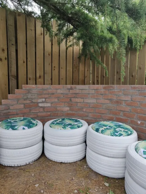 Если вставить внутри деревянное основание и обтянуть верх тканью, можно получить невероятно прочный пуфик, который легко выдержит любого взрослого и не деформируется. По желанию можно добавить ножки, чтобы было проще поднять импровизированный табурет и переместить в нужное место на вашем дачном участке.