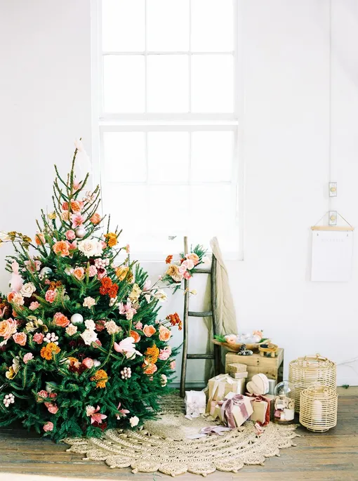 Чтобы сделать дерево по-настоящему уникальным, украсьте его вашими любимыми цветами: розами, лилиями, гладиолусами, ирисами и так далее. Правда, чтобы такая елка простояла долго, лучше использовать не живые, а искусственные цветы. Благо, сейчас можно найти варианты максимально похожие на настоящие.