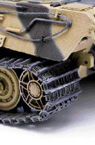 Можно купить дополнительный комплект фототравленых деталей или слепить «циммерит» из шпаклевки, как это и делалось когда-то на заводе «Хеншель» в Касселе. Фототравление наклеивается на пластик клеем «Супермомент», а шпаклевка размазывается тонким слоем, после чего по ней аккуратно наносится рисунок. Его можно продавить маленьким шпателем или заточенной деревянной лопаточкой, а можно использовать специальный зубчатый «гребешок» фирмы Tamiya. При этом необходимо оставить без покрытия участки башни для нанесения эмблемы 505-го батальона и зону повреждения от «попадания 76-мм снаряда».