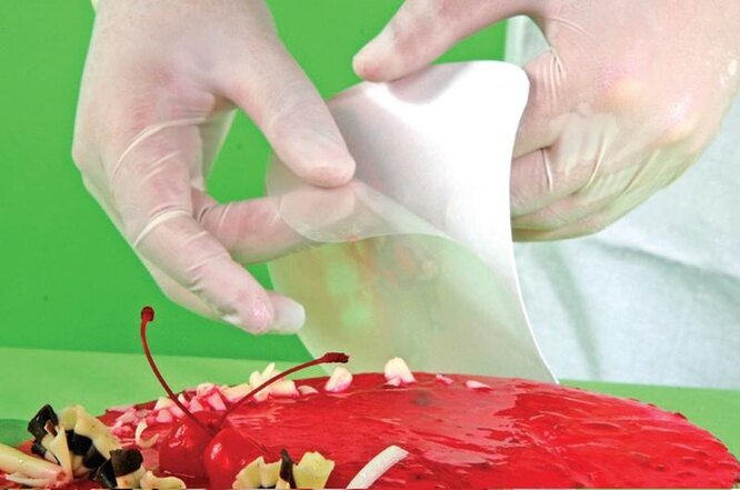 На переводной пленке для шоколада следует печатать зеркальное отображение исходного файла. Пленку кладут изображением вниз на расплавленный шоколад. После того как он застывает, картинка остается на поверхности. Точно так же работает и пленка для перевода изображения на мороженое.