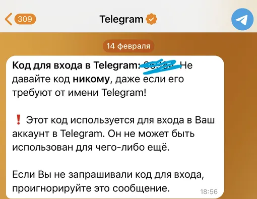 Одноразовый код для входа придет в чате с аккаунтом Telegram — это канал служебных уведомлений, который привязан к номеру +42777.