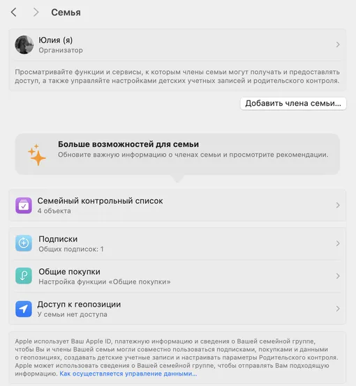 Она позволяет объединить до шести человек в одну группу, где можно делиться подписками, покупками и даже хранилищем iCloud+, при этом сохраняя личное пространство каждого участника.