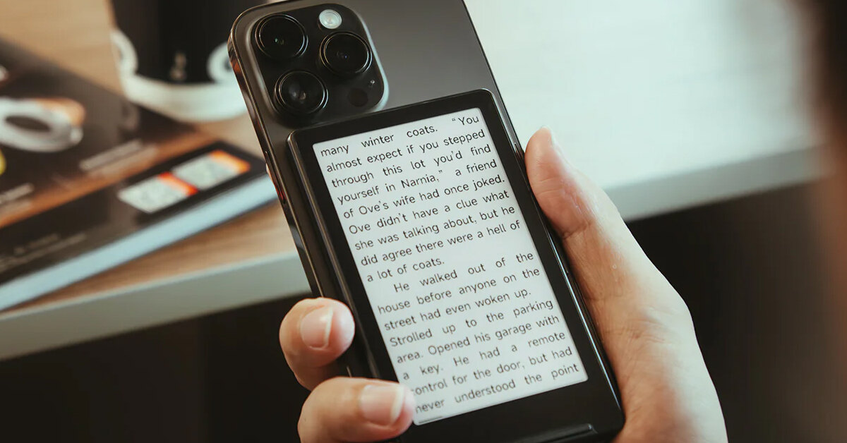 Это устройство с 4,3-дюймовым экраном E Ink, которое меньше и тоньше любой модели Kindle или Kobo. Но главная фишка не в размере, а в том, что ридер можно магнитно прикрепить к задней панели iPhone, Pixel 10 или любого другого смартфона с поддержкой MagSafe или Qi2.