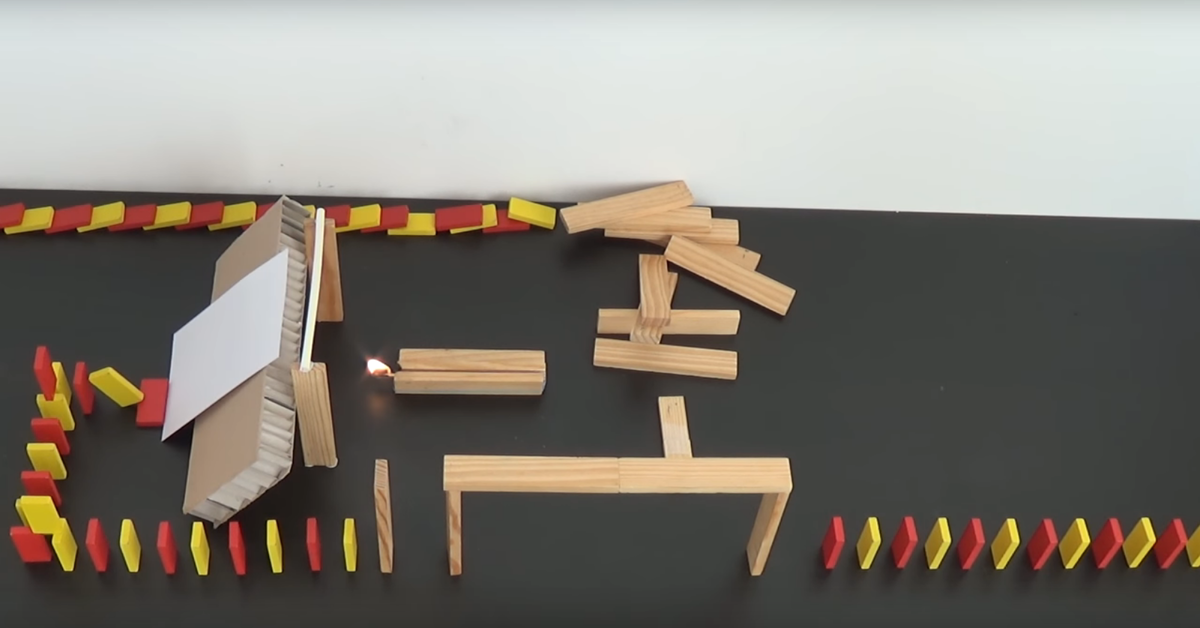 В следующем видео YouTube-пользователя Kaplamino магия домино соединена с огнем и взрывчатыми веществами, чтобы внести разнообразие в последовательность падающих костяшек. Каждая часть этой машины Руба-Голдберга сначала показывается отдельно, а потом они демонстрируются вместе.