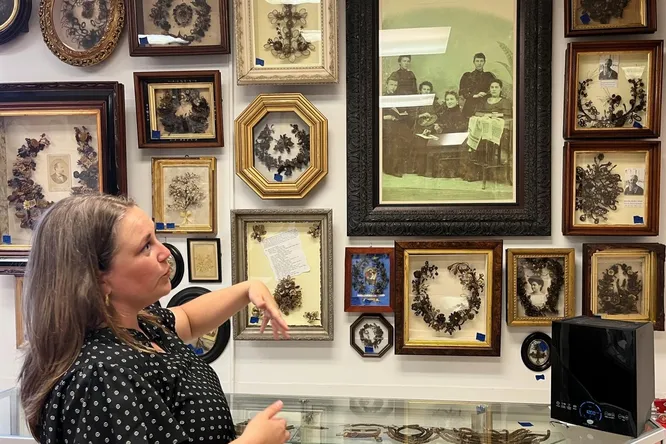 Среди редких экземпляров — венок с волосами всех женщин Лиги избирательниц Вермонта 1865 года и брошь с локоном семилетней девочки, умершей в 1811 году.