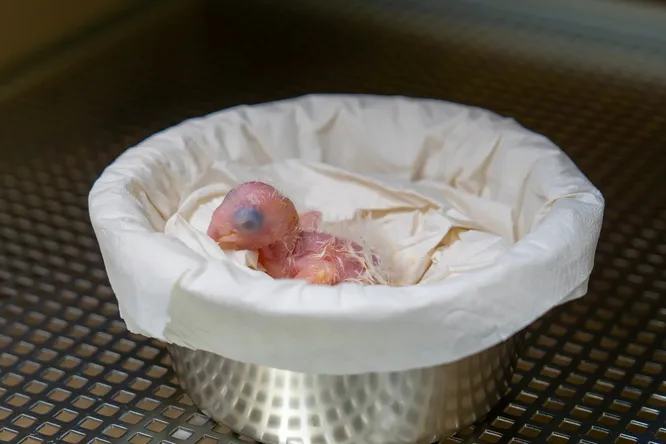 Пока новорожденный совсем не похож на знаменитого синего красавца – скорее на розоватый комочек. Но уже скоро он начнет покрываться фирменными ярко-голубыми перьями.