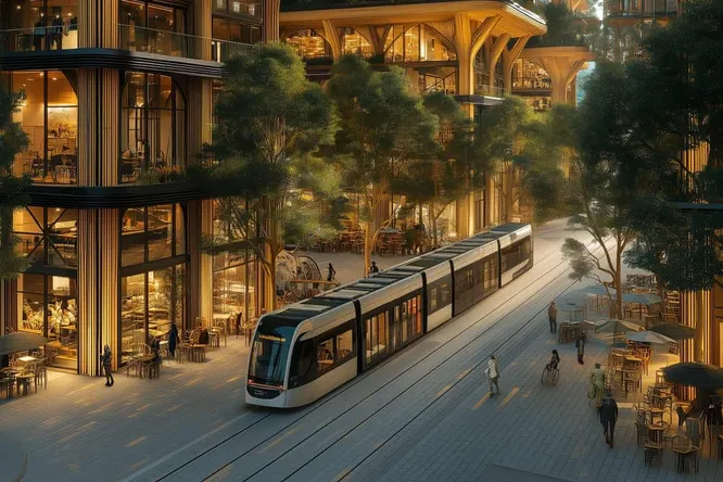 - Город задуман с «человеческим масштабом»: кварталы без машин, безопасные пешие маршруты, деревянная модульная архитектура и трамвайная сеть.