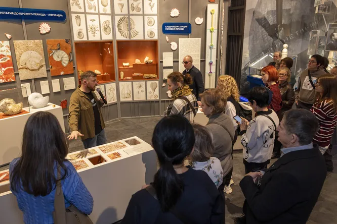 Поближе познакомиться с ископаемыми существами и рассмотреть реальные фрагменты облицовочной плитки станций теперь можно в выставочном зале Московского планетария. Экспозиция сосредоточена вокруг организмов, населявших Землю в юрский и меловой периоды: аммонитов, наутилусов, брахиоподов, гастроподов, белемнитов, криноидей, двустворчатых моллюсков, кораллов и губках.
