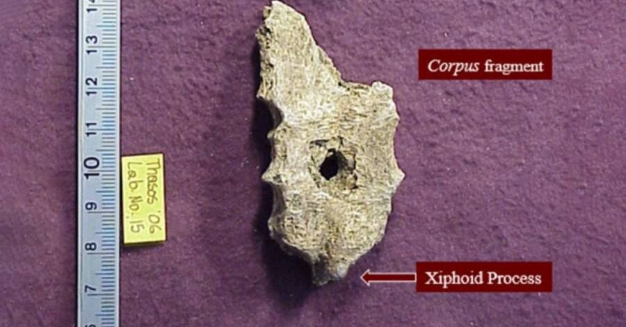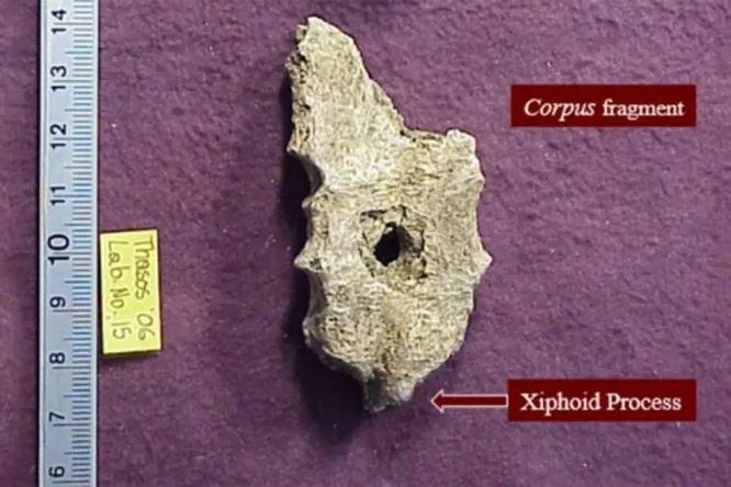 Во время раскопок на греческом острове Тасос археологи обнаружили останки 57 человек эллинистического периода. Один скелет сразу выделился на фоне остальных: в его грудине находилось аккуратное отверстие правильной формы.