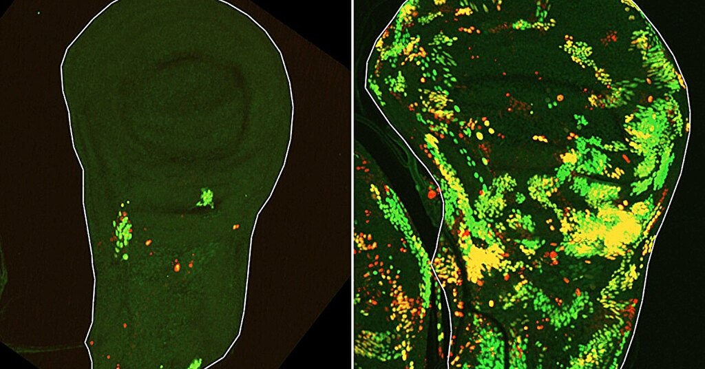 Ученые повторили классический эксперимент с облучением личинок дрозофил, но использовали современные генетические технологии для детального отслеживания процесса. Исследователи обнаружили две популяции клеток, переживающих облучение. DARE-клетки активируют программу самоуничтожения (апоптоз), но несмотря на это выживают и активно размножаются, восполняя почти половину поврежденной ткани за 48 часов. NARE-клетки не запускают апоптоз, но участвуют в регенерации.