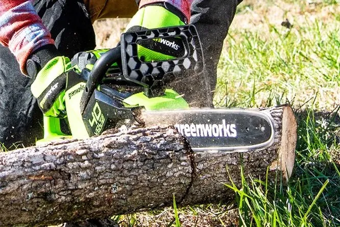 - Аккумуляторная пила сочетает мобильность бензопилы и простоту электропилы. Подойдет для периодических работ в помещении и на участке, когда нужно обрезать несколько веток, распилить бревна для бани или взять инструмент с собой туда, куда не протянешь кабель.