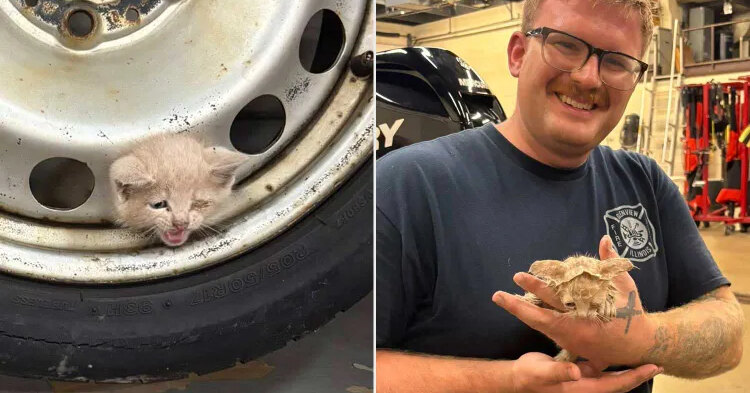 Мужчины сообщили команде пожарной части, что бездомная кошка недавно родила пятерых котят в их гараже, и один из котят застрял в колесе. Именно тогда лейтенант Рендер вместе с пожарными Кифом и Чепменом приступили к работе, говорится в заявлении.