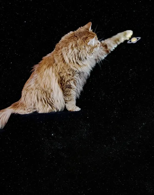 На получившихся кадрах Эндрю Маккарти пушистый кот тянется к Сатурну, словно хочет поймать кольца планеты, греется под ярким Солнцем, лежит на «поверхности» Луны и даже превращается в центр миниатюрной галактики.