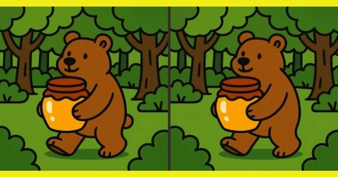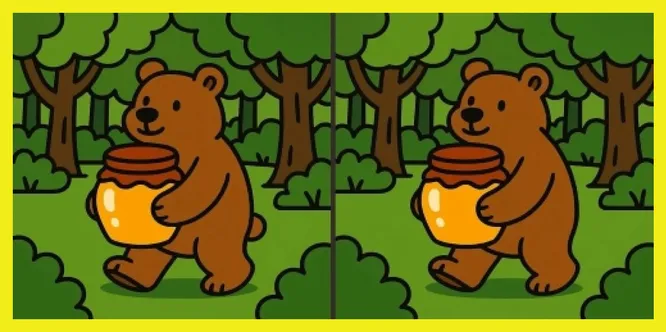 Кажется, этот медведь просто прогуливается по лесу с банкой свежего меда – но не все так просто. Две картинки почти одинаковы, но кое-что в них не сходится. Сможете найти между ними отличия?