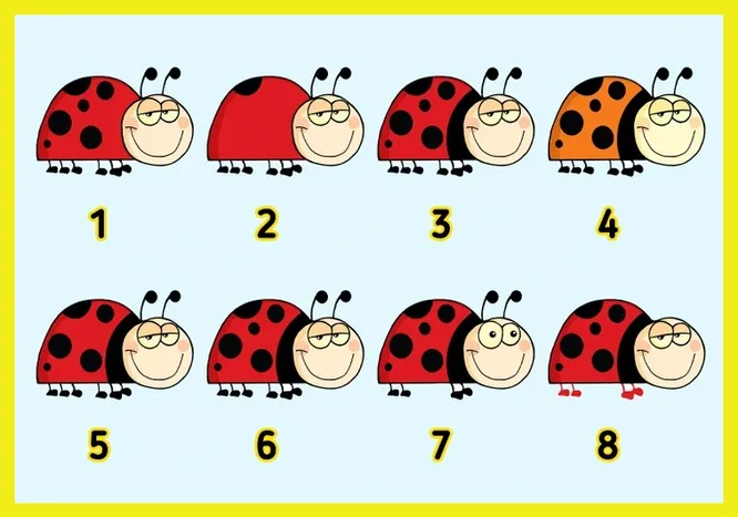Перед вами восемь мультяшных божьих коровок. Каждая из них слегка отличается от других – где-то меньше пятен, где-то другой оттенок крыльев или взгляд. Но две из них – близнецы, полностью одинаковые. Включайте таймер на 9 секунд и попробуйте их отыскать!