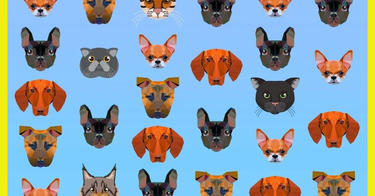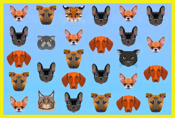 Перед вами – яркая картинка на голубом фоне, где собрались десятки собачьих портретов: пушистые морды, внимательные глаза, хвостатое очарование. Но среди них спрятались хитрые коты, решившие прикинуться своими «четвероногими оппонентами». Ваша задача – найти и сосчитать всех кошек.