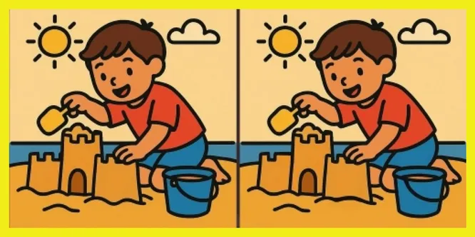 На картинках ниже изображен мальчик, который строит из песка замок. Рядом стоит синее ведерко, а в небе сияет яркое летнее солнце. Оба рисунка кажутся одинаковыми, но различия есть — и ваша задача их найти.