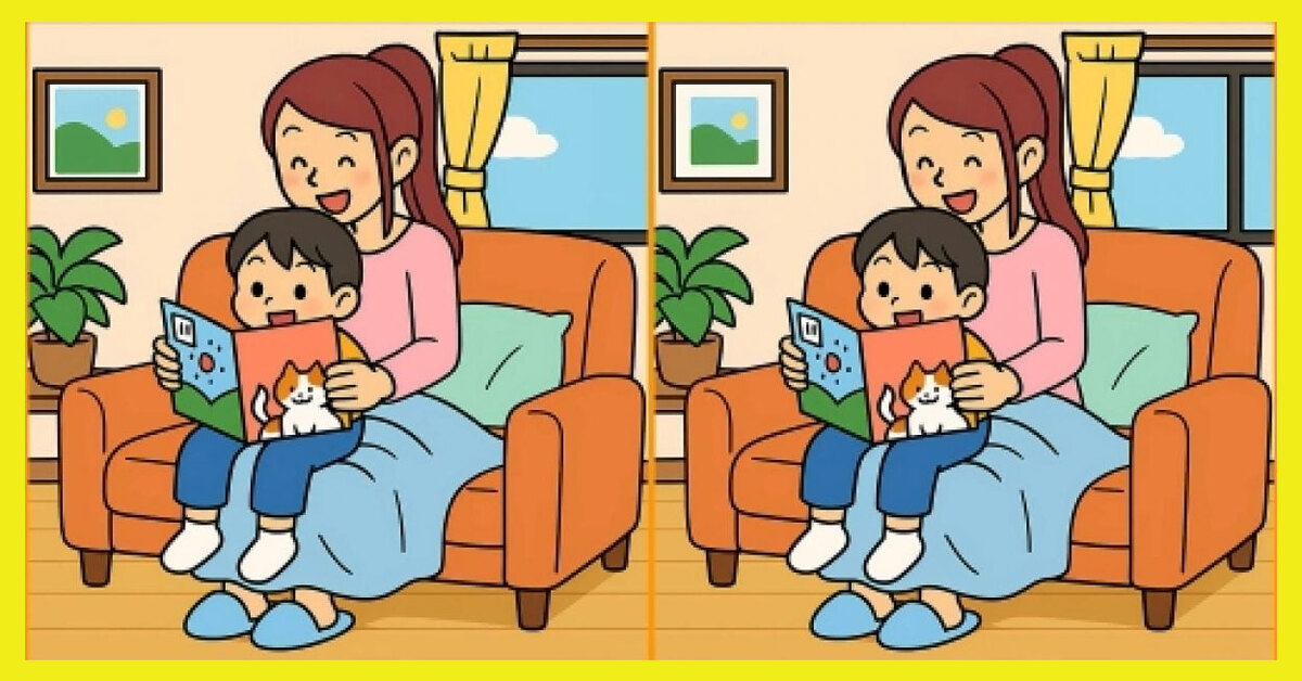 Посмотрите на картинки: мама сидит на диване, сын на ее коленях с книжкой, вокруг – атмосфера уюта и тепла. Но между этими двумя изображениями есть три крошечных несоответствия. Поставьте таймер на 19 секунд и попробуйте найти их все.