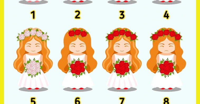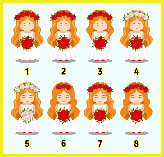 На картинке – 8 светловолосых невест в белых платьях. У каждой венок из роз (красных или белых), букет (тоже красный или белый), своя прическа и выражение лица. Но среди них спрятана одна идеальная копия – две невесты, которые совпадают полностью. Засеките 15 секунд и попробуйте найти эту идентичную пару.