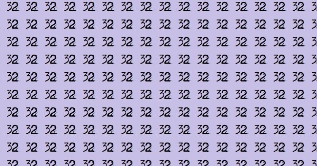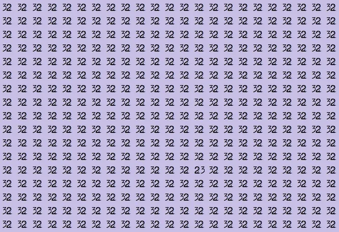 На сиреневом фоне вы увидите ряды одинаковых чисел «32». Но среди них хитро спряталось одно-единственное «23».Поставьте таймер на 12 секунд – и начинайте поиск!