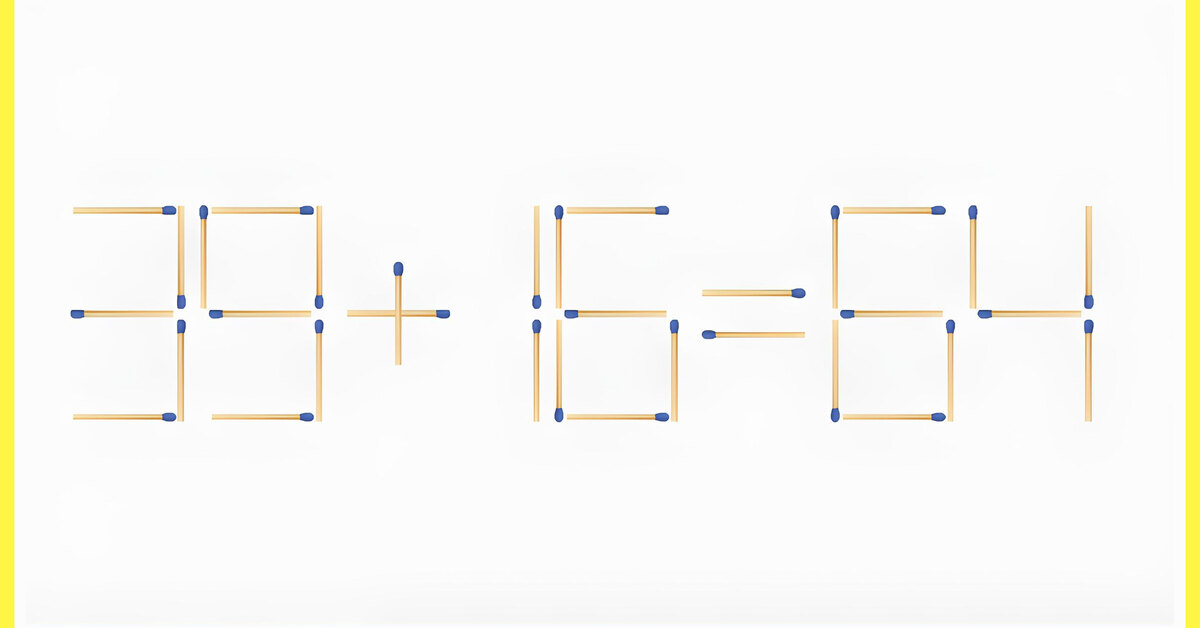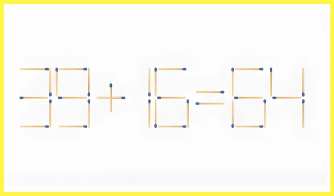 Взгляните на картинку ниже: перед вами выложенный из спичек пример, который определенно решен с ошибкой, ведь если сложить 39 и 16, получится 55 — явно не 64. Получайте, из какого числа нужно забрать одну спичку и куда её следует переместить, чтобы по итогу получилось верное равенство.