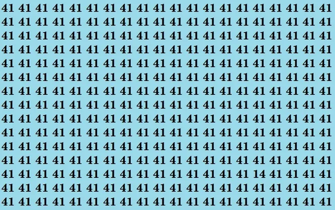 На светло-берюзовом фоне раскиданы десятки одинаковых чисел 41. Но одно из них особенное – 14 спряталось среди них и почти не выдает себя. Ваша миссия проста на словах: засеките 14 секунд и попробуйте отыскать его. Только не дайте цифрам запутать ваш взгляд!