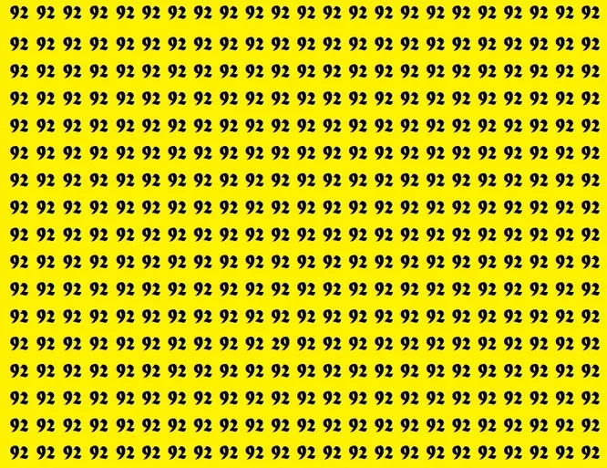 Перед вами яркое задание: на желтом фоне рассыпаны десятки одинаковых чисел 92, но где-то среди них спряталось одно-единственное 29. Засеките 20 секунд, настройтесь на поиск – и попробуйте обнаружить это упрямое исключение из правил.