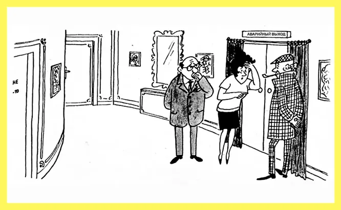 Заметили табличку над дверью? Согласно технике безопасности, аварийные выходы должны открываться наружу, чтобы не препятствовать эвакуации людей в экстренных ситуациях. Так что женщина не могла врезаться в нее, когда та открылась. А значит, историю она выдумала.