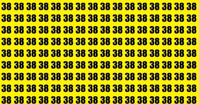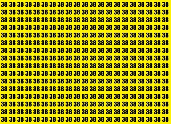 Если хочется быстро разогнать внимание, вот идеальный челлендж: на ярко-желтом фоне спряталось одно-единственное число 83, утонув среди десятков одинаковых 38. Проверьте, насколько острым бывает ваш взгляд, когда время ограничено – у вас есть всего 12 секунд.