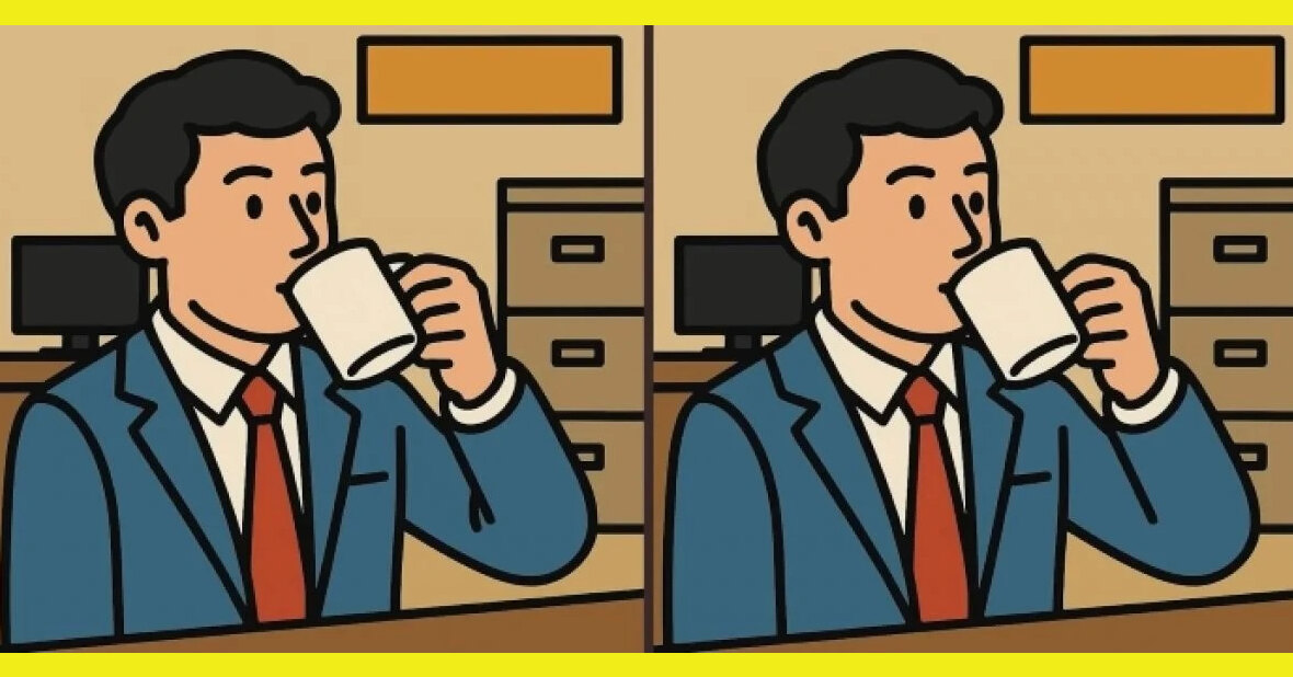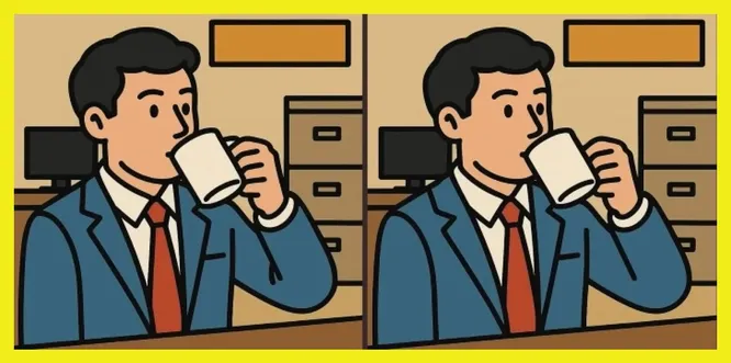 Переход к головоломке! Перед вами два рисунка: мужчина в деловом костюме сидит за столом, делает глоток кофе и, кажется, наслаждается редкой минутой спокойствия. Но между картинками что-то явно не сходится. Поставьте таймер на 17 секунд и попробуйте отыскать три отличия – они маленькие, но видимые, если внимательно всматриваться.