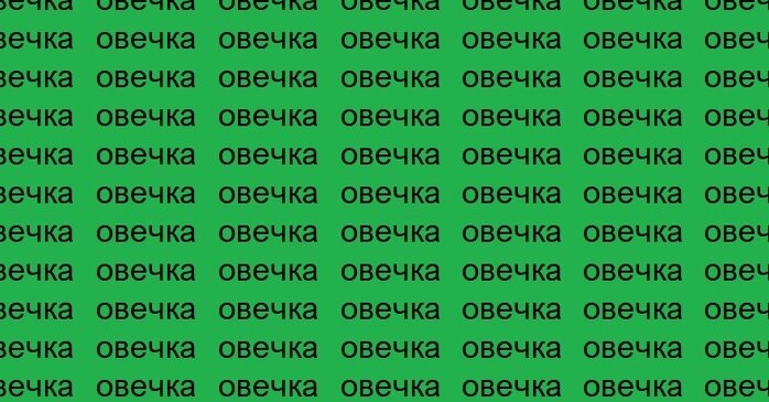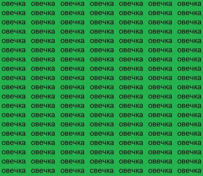 На зеленом фоне размещены десятки одинаковых слов «овечка». Но среди них затесалось одно единственное слово «свечка» – аккуратное, скромное, но заметное тем, кто не торопится глазами. Засеките 8 секунд и попробуйте найти его до того, как таймер «сгорит».