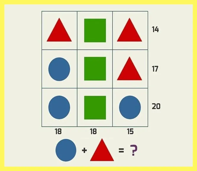 Если посмотреть на каждый отдельный столбец и на каждую строку, то число рядом — это сумма всех фигур, расположенных напротив. То есть, если сложить красный треугольник, зеленый квадрат и еще один красный треугольник, то получится 14.
