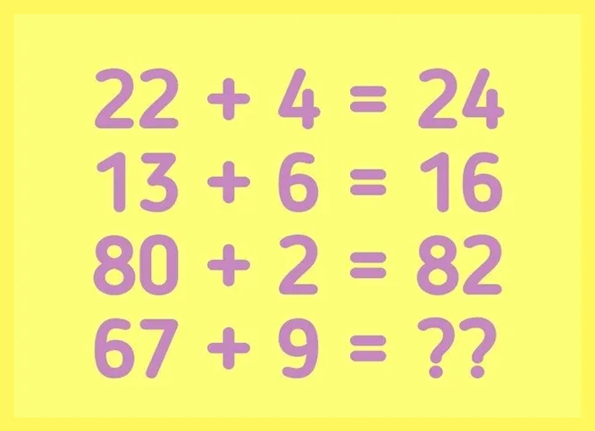 Ниже на картинке представлены четыре примера, три из которых уже решены. Однако, как вы можете заметить, в ответах представлены не просто суммы чисел. Что за закономерность тут скрывается? Попробуйте понять логику и решите последний пример.
