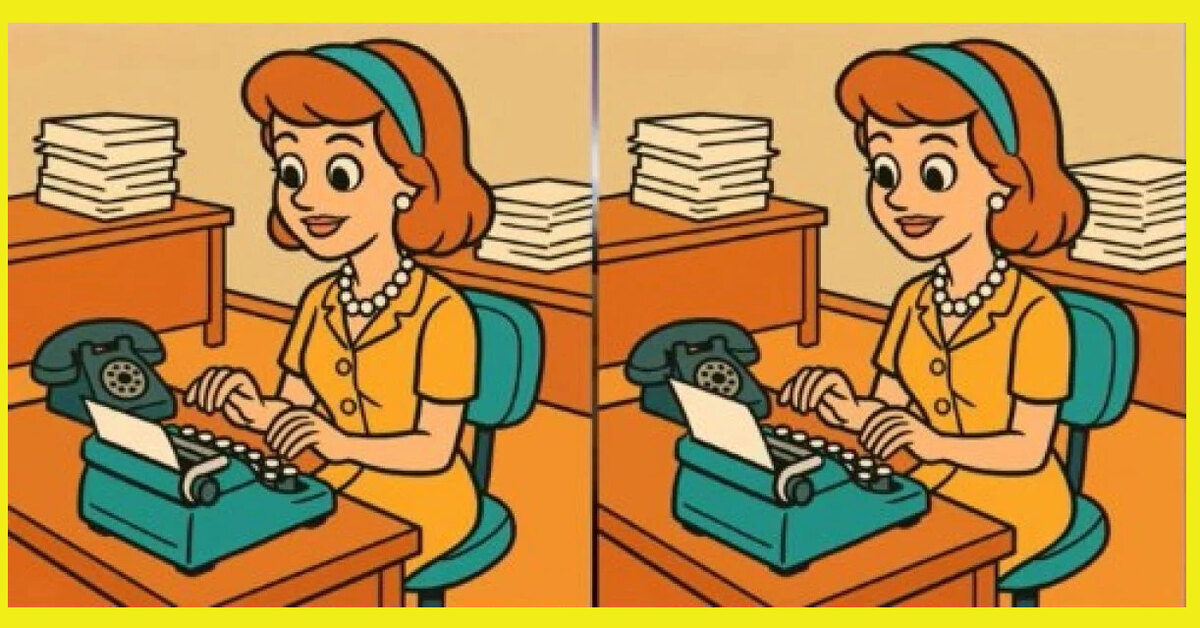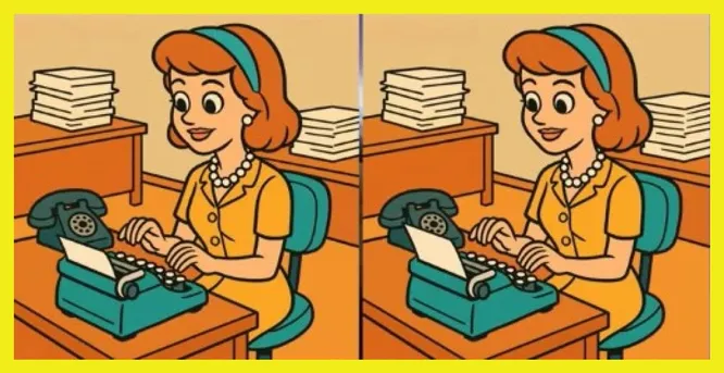 На двух почти одинаковых рисунках изображена девушка за столом: она печатает на печатной машинке, рядом стоит старый телефон, а за спиной аккуратно сложены стопки бумаги. Между картинками спрятались три отличия.