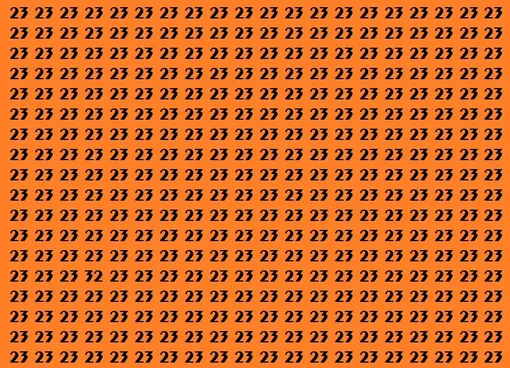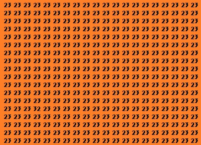 Перед вами картинка с оранжевым фоном, на котором повторяется одно и то же число – 23. Но среди них спряталось одно-единственное 32. Засеките 10 секунд, сосредоточьтесь и начинайте поиск.