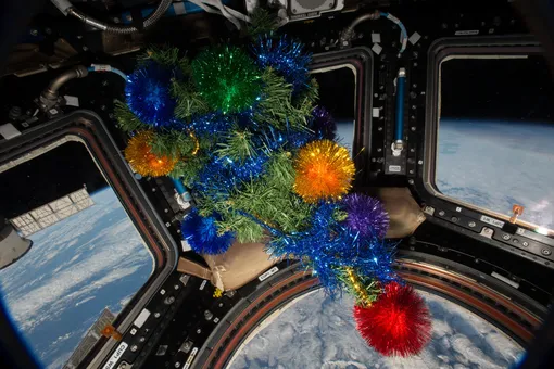 Если вам кажется, что космос и Новый год — вещи несовместимые, то вам только кажется. Космонавты научились создавать праздничную атмосферу вокруг себя: наряжают елку (искусственную, конечно) самыми обычными игрушками, развешивают украшения и, конечно, надевают красные шапки Деда Мороза.