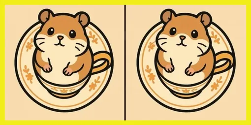 На двух почти одинаковых изображениях – очаровательный хомячок, уютно устроившийся в чашке, которая стоит на блюдце. Все выглядит одинаково... но это только на первый взгляд. Между картинками спрятались три отличия.