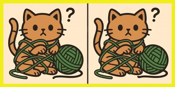 Готовы проверить свою внимательность за считаные секунды? Где-то между усами, нитками и удивленным взглядом кота спрятались три хитрых отличия – и они уже ждут, заметите ли вы их раньше таймера.