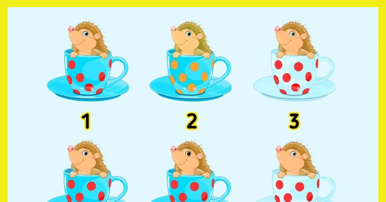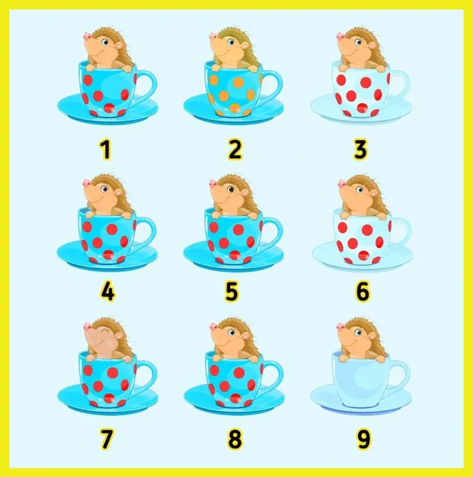 Сосредоточьтесь и постарайтесь не отвлекаться. Не спешите хаотично – сравнивайте ежиков последовательно. Обращайте внимание на узоры на чашках, их цвет и эмоции на мордочках.