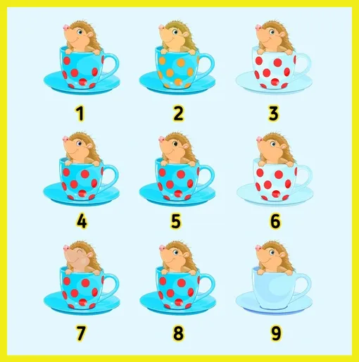 На изображении ниже – девять ежиков, которые уютно устроились в чашках на блюдцах. Все они похожи, но отличаются нюансами: цветом чашки, наличием или отсутствием горошка и выражением мордочки. Однако двое из них абсолютно одинаковые.