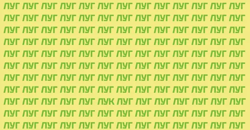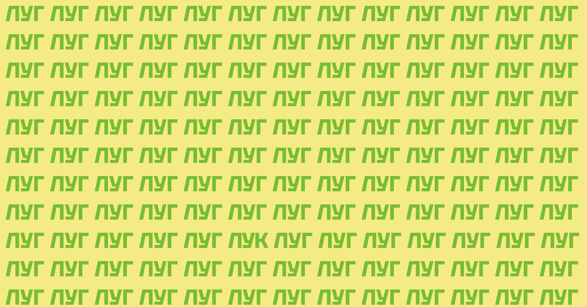Начнем развивать когнитивные функции прямо сейчас? Внимание на картинку, прикрепленную ниже! На однотонном фоне огромное количество слов «луг», но где-то среди них скрывается одно лишнее слово, отличающееся всего одной буквой — «лук». Получится ли у вас его найти за 11 секунд?