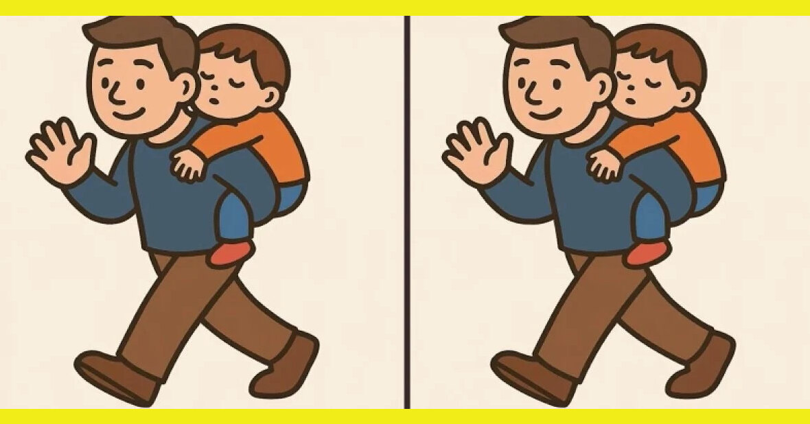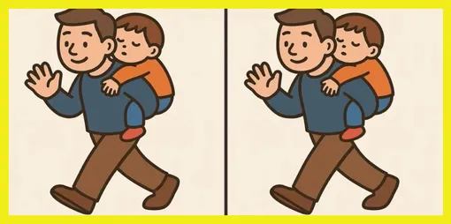 На двух почти одинаковых рисунках изображен шагающий папа, а на его спине мирно спит сынок. Сцена выглядит одинаково уютной, но это лишь на первый взгляд. Между картинками спрятались три отличия.