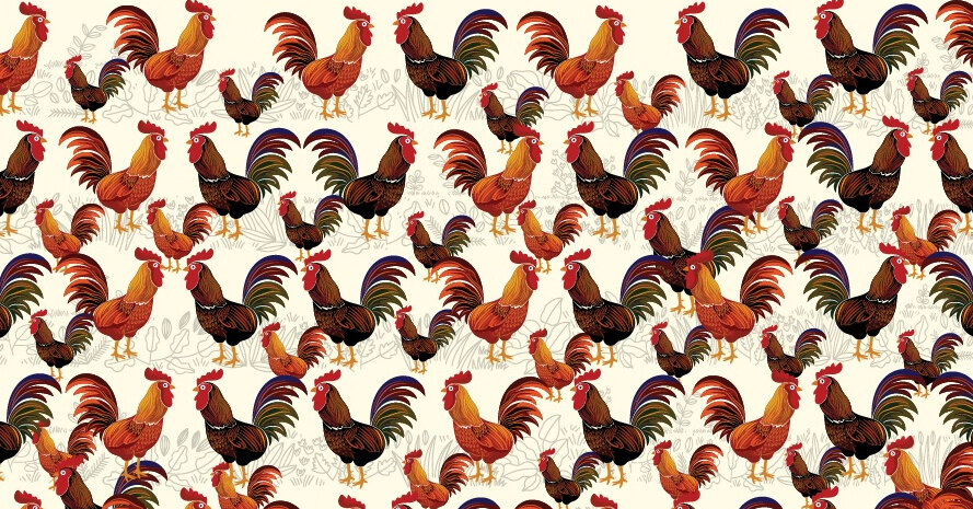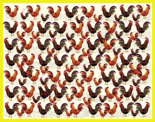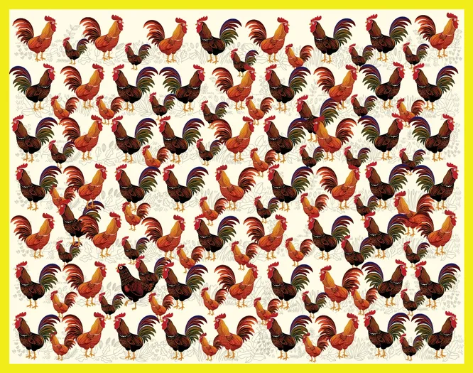 Перед вами изображение: множество петухов – разных размеров и оттенков. Одни темнее, другие светлее, какие-то больше, какие-то меньше. Но среди всей этой пе строй компании спряталась одна-единственная курица. Ваша задача – найти ее за 20 секунд.