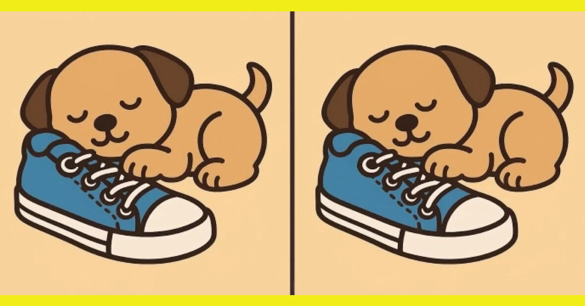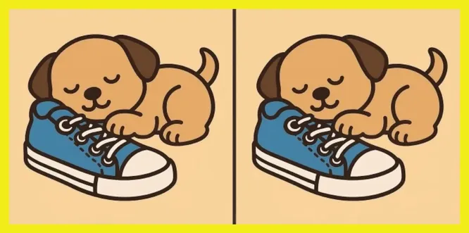 Готовы на минуту выключить суету? Перед вами почти одинаковые картинки с очаровательным щенком, который сладко уснул прямо на синем ботинке. Но не дайте умилению вас обмануть – здесь спряталась маленькая ловушка для внимания.