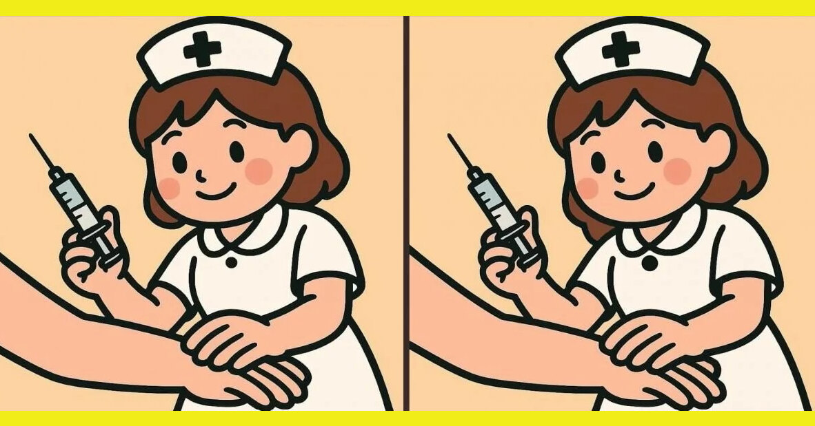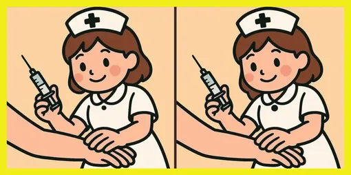 Перед вами два почти одинаковых рисунка. На них изображена добрая медсестра, которая готовится сделать пациенту укол в руку. Обстановка спокойная, все выглядит привычно... но это только на первый взгляд. Между картинками спрятались 3 отличия.