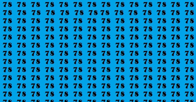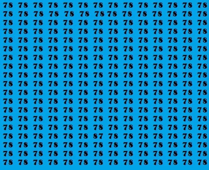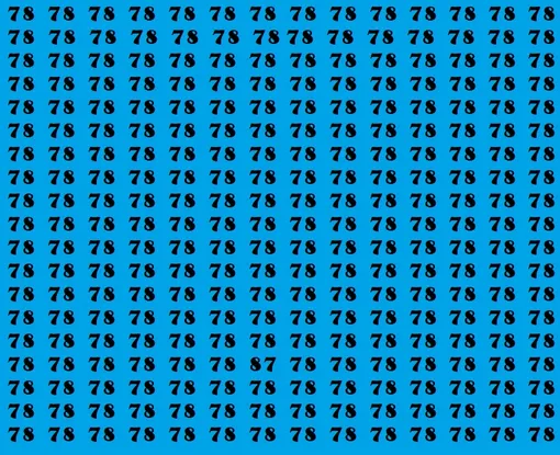 Перед вами картинка: на синем фоне расположено множество одинаковых чисел 78. Они похожи друг на друга, стоят плотным «строем» и специально сбивают с толку. Но среди них спряталось одно-единственное число – 87.
