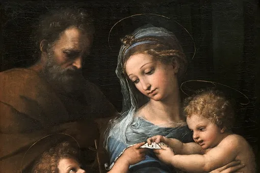 - При этом специалисты обращали внимание, что Иосиф отличается по палитре и «исполнению» от остальных фигур — Мадонны, младенца и Иоанна Крестителя.